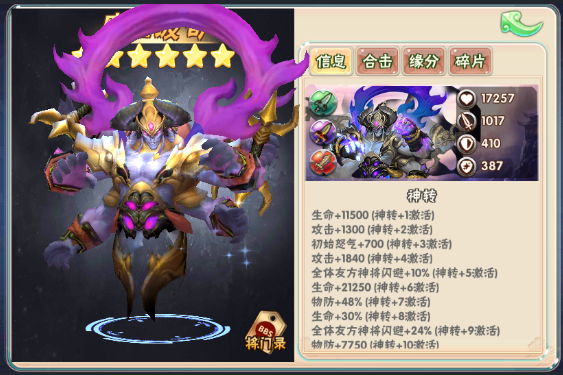 推荐指数:☆☆☆☆☆☆(六星)、生命+11500(神转+1激活)、攻击+1300(神转+2激活)、初始怒气+700(神转+3激活)、攻击+1840(神转+4激活)、全体友方神将闪避+10%(神转+5激活)、生命+21250(神转+6激活)、物防+48%(神转+7激活)、生命+30%(神转+8激活)、全体友方神将闪避+24%(神转+9激活)、物防+7750(神转+10激活)、全体友方神将闪避+32%(神转+11激活)、物防+108%(神转+12激活)