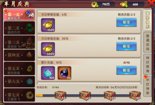 其七天5星张飞随性送,送300张飞碎片,突破五星,如虎添翼,无人可及!七级宝石箱半价购买!