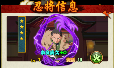 【简介】奈良鹿丸的父亲,与山中亥一、秋道丁次同为前代“猪鹿蝶”组合的成员,有着在鹿丸之上的谋略和判断力,是木叶忍者村上忍班的班长,智商非常的高,善于指挥作战。