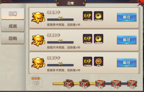 领取周卡、月卡、年卡任务:领取这些卡的奖励后会获得47400经验、14W多金币以及10点VIP经验值的奖励。