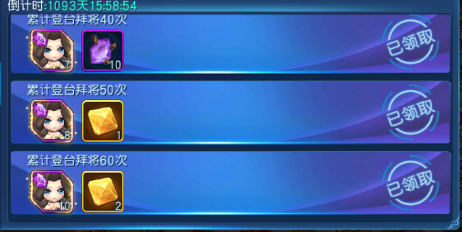 登台拜将,多重好礼等你来拿,拜将次数达到1、2、3、10、20、30、40、50、60次即可获得对应的奖励,累计登台拜将1次获得步练师信物1和10个战魂强化石,累计2次获得2个步练师信物10个战魂强化石,累计三次获得步练师信物3个以及20个战魂强化石,累计登台败将10次获得4个步练师信物以及20个战魂强化石、累计20次获得5个信物以及40个强化石,累计登台拜将30-40次获得13个信物以及20个战魂突破石,累计50-60次获得18个信物以及3个宝物觉醒石。