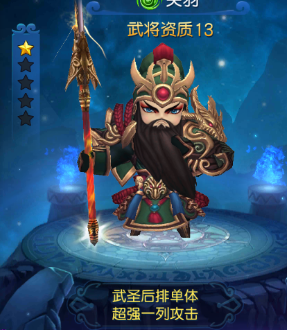 1技能武圣:对任意1个敌人进行10连击,每击造成4267点物理伤害,暴击时暴击伤害提高12.4%,且每次暴击提高物理攻击力12.1%,最多100.0%,持续2回合。